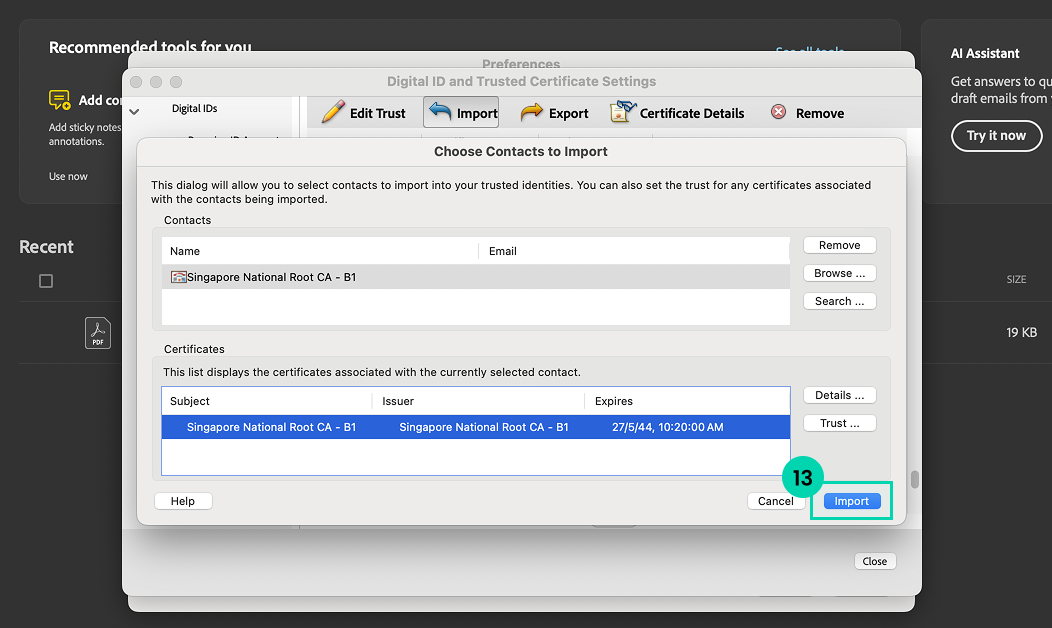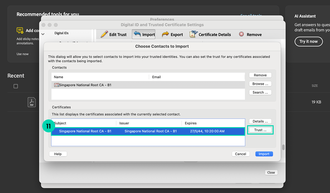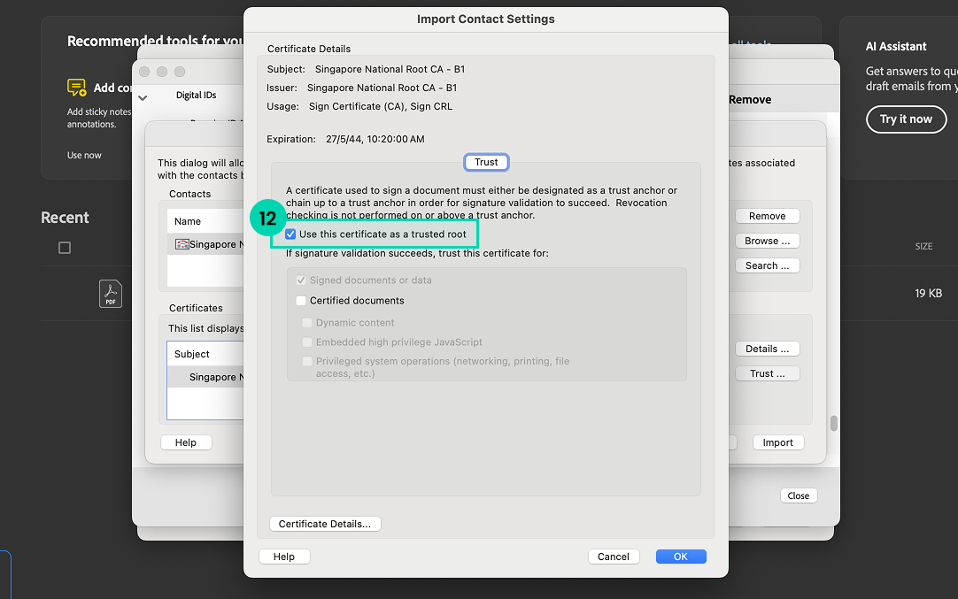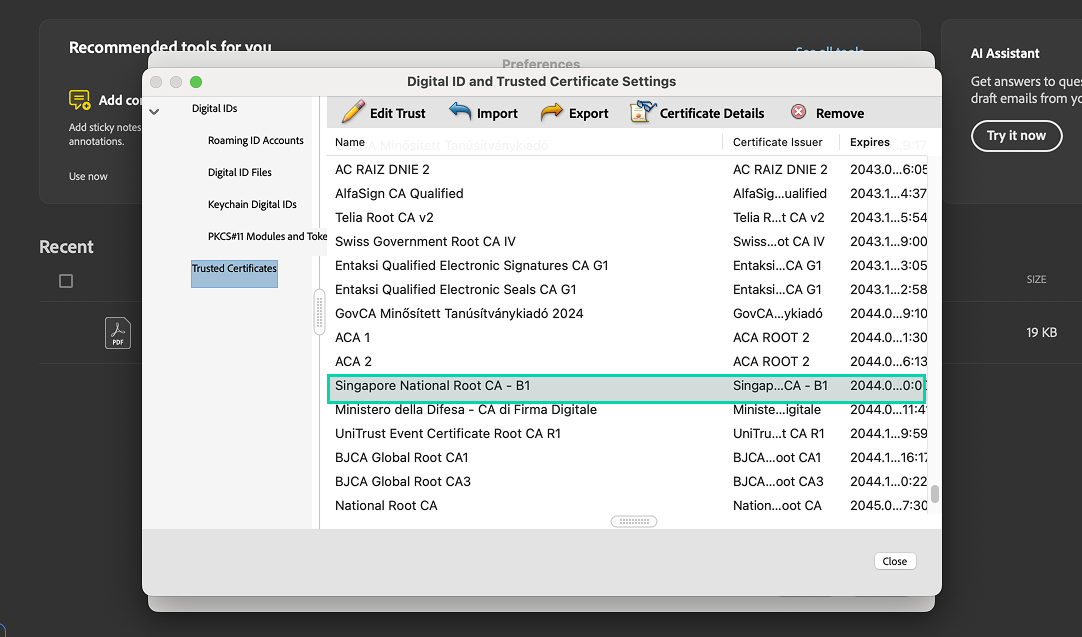Before that, the Singpass root signing certificate must be installed on your device and configured for your Adobe Acrobat Reader: