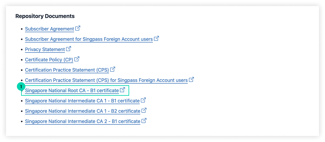 **Go to** [**GovTech CA Repository**](https://repository.nca.gov.sg/) **and download Singapore National Root CA - B1 Certificate.**