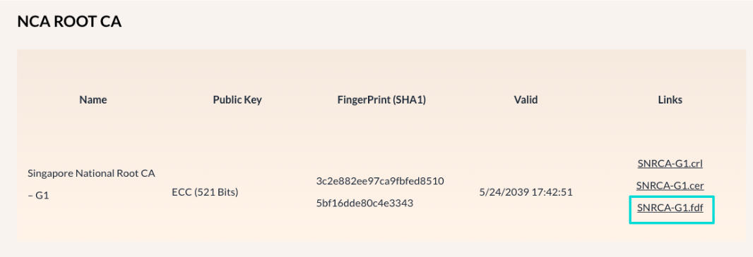 **Go to** [**Assurity NCA repository**](https://product.assurity.sg/nca/) **and download "SNRCA-G1.fdf" under "NCA Root Cert"**