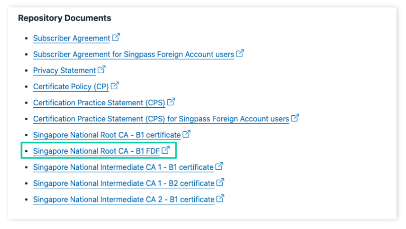 **Go to** [**GovTech CA Repository**](https://repository.nca.gov.sg/) **and download "Singapore National Root CA - B1 FDF"**